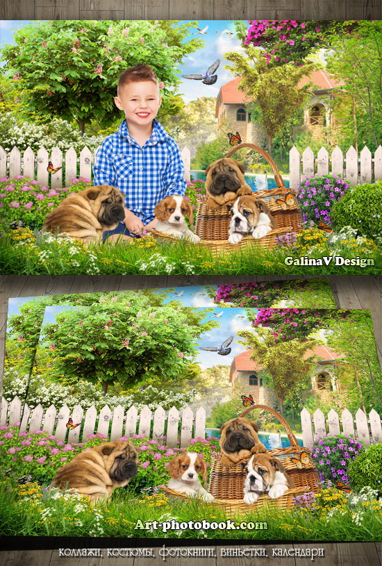 Коллаж В саду со щенками